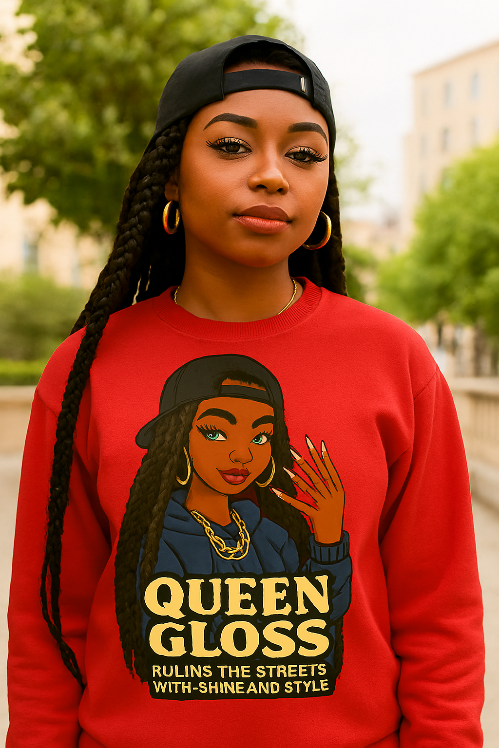 This limited-edition crew neck features our fiery freckled queenβred curls, radiant skin, and a whole attitude of her own. Styled with bold hoops and a glossy stare, she brings the original QUEEN GLOSS graphic to life without changing a thing. Perfect for girls who lead with style and speak with sparkle.