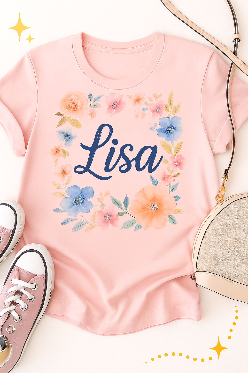 💡 Please Note: We do not create Disney or other copyrighted images. Your design must be original and uniquely yours. Shoes and purse shown in photos are for styling inspiration only and are not included. No Disney Images.