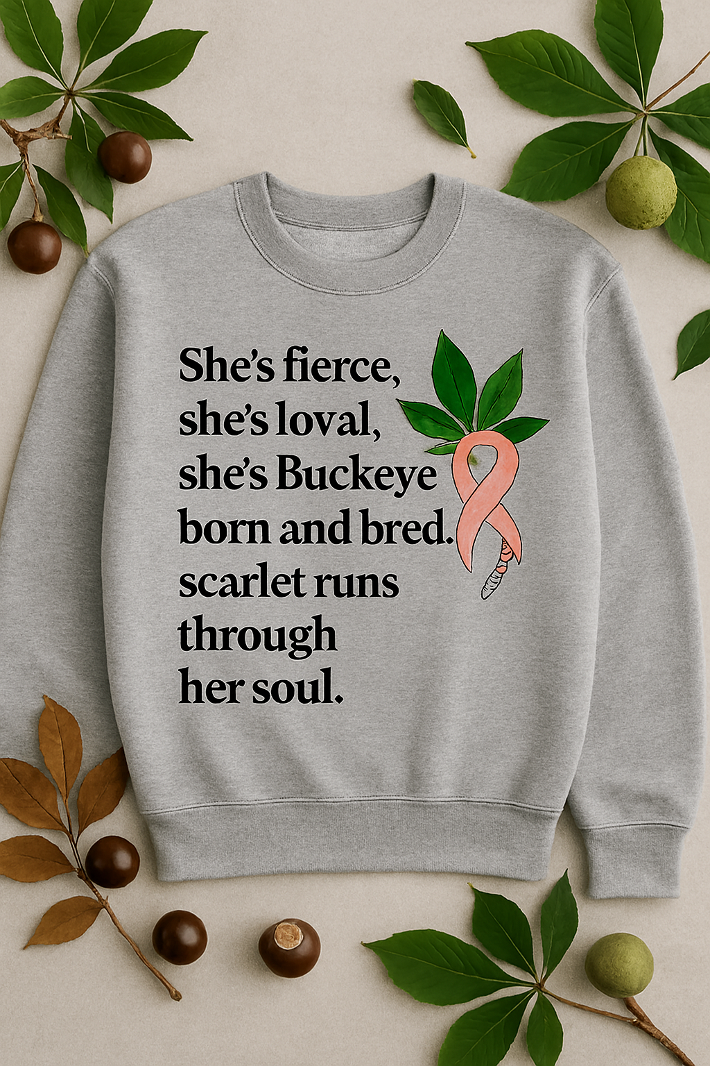 Wrap yourself in heritage and heart with the “Scarlet Soul, Buckeye Born” crew neck—where fierce loyalty meets timeless style. Available in soft cream and classic white, and light gray, this sweatshirt features bold serif typography and a striking Buckeye leaf entwined with a pink breast cancer awareness ribbon. It’s more than merch—it’s a statement of pride, resilience, and roots deep in the Buckeye State.